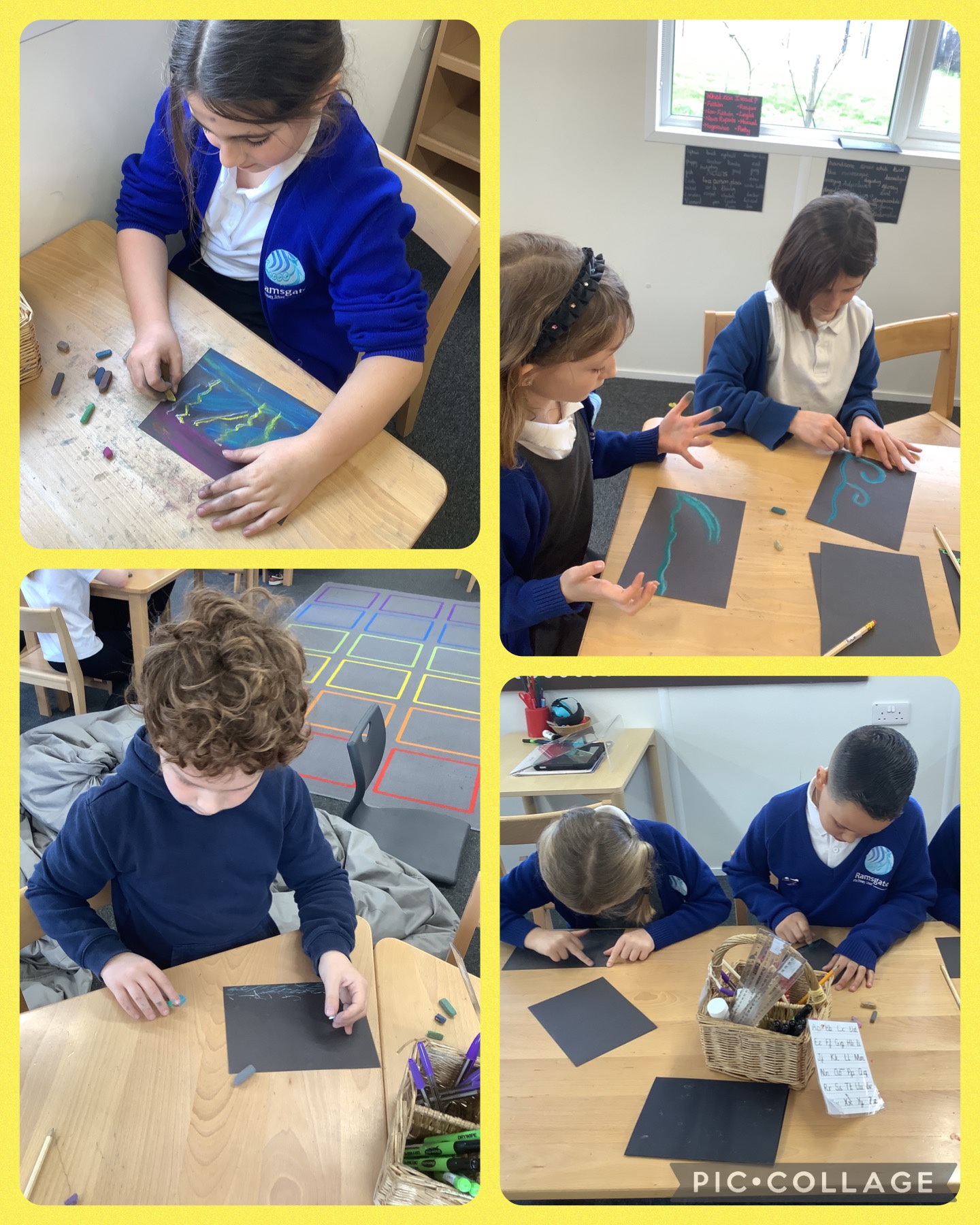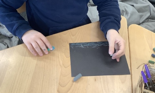 In the build up to writing a setting description of the storm scene in our book 'The Green Ship', we used pastels to create a stormy scene of our own. We then annotated these with vivid verbs, using masking tape and whiteboard pens.