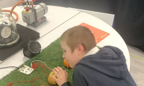 We then had an amazing workshop with school of noise! We explored the science of sound and how it is used in different ways around the world. We learnt about sound design for electric cars and films, how sound can help put out fires, and how it is used when designing buildings. We found out how sounds are made through vibrations and learnt about pitch and volume. We also learnt how sound travels and what happens when it reaches our ears, including how it can be absorbed or reflected. We had lots of fun experimenting with different equipment, including Chladni plates where sand makes patterns using vibrations, musical instruments like a theremin and an omnichord, tuning forks, and a model of a human ear. We even used fruits and vegetables to create musical sounds when we touched them!
