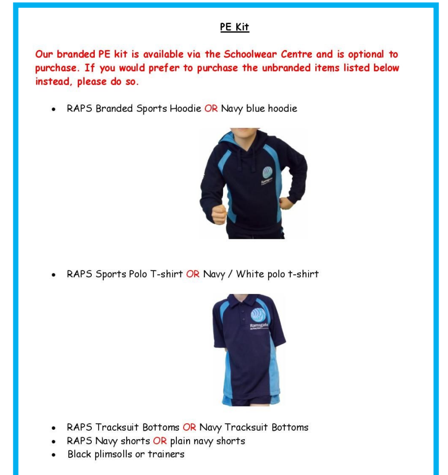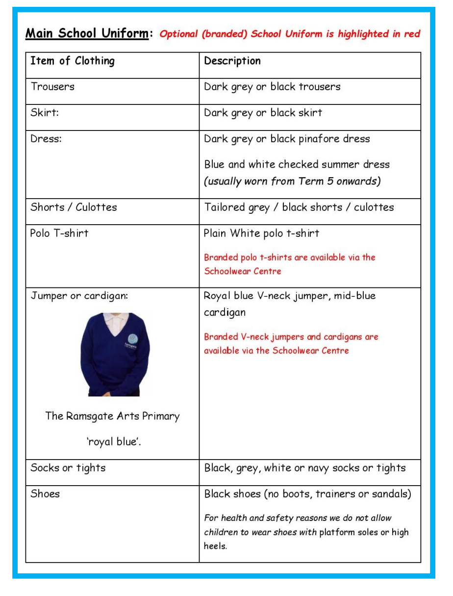 Our uniform is available to buy online or in store at the Schoolwear Centre, 85 High St, Margate – 01843 293555. Please buy new items or pre-loved items (at a reduced cost) online. Click here to visit the Schoolwear Centre website.