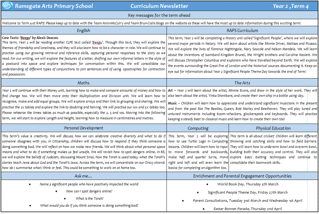 We hope you have all had a lovely week and that you were able to relax and recharge ready for this Easter term. Keep an eye out via the RAPS newsletter, our class blog and classroom windows for more information about the term ahead. Parent reading will be on alternate Wednesdays at 2.40pm, World Book Day approaches, and we also have a Topic Theme Day to come! Best wishes, Year 2 team :)