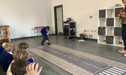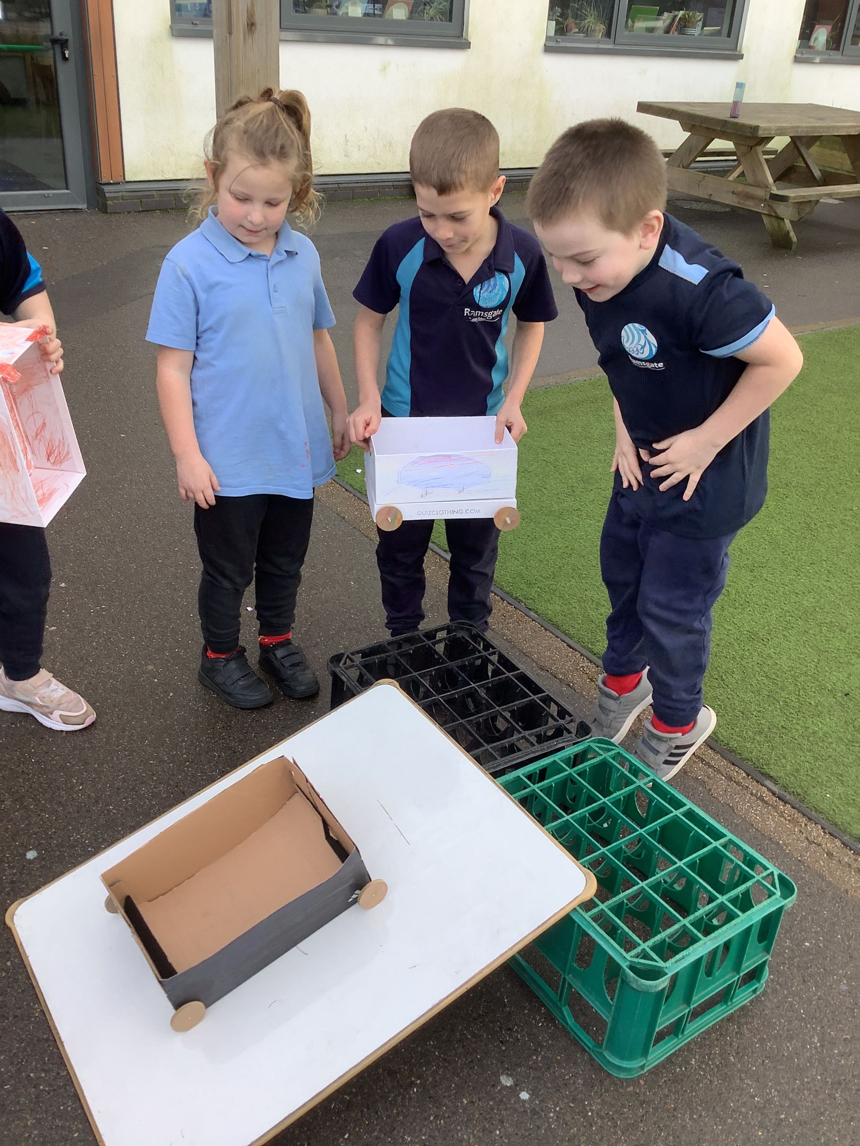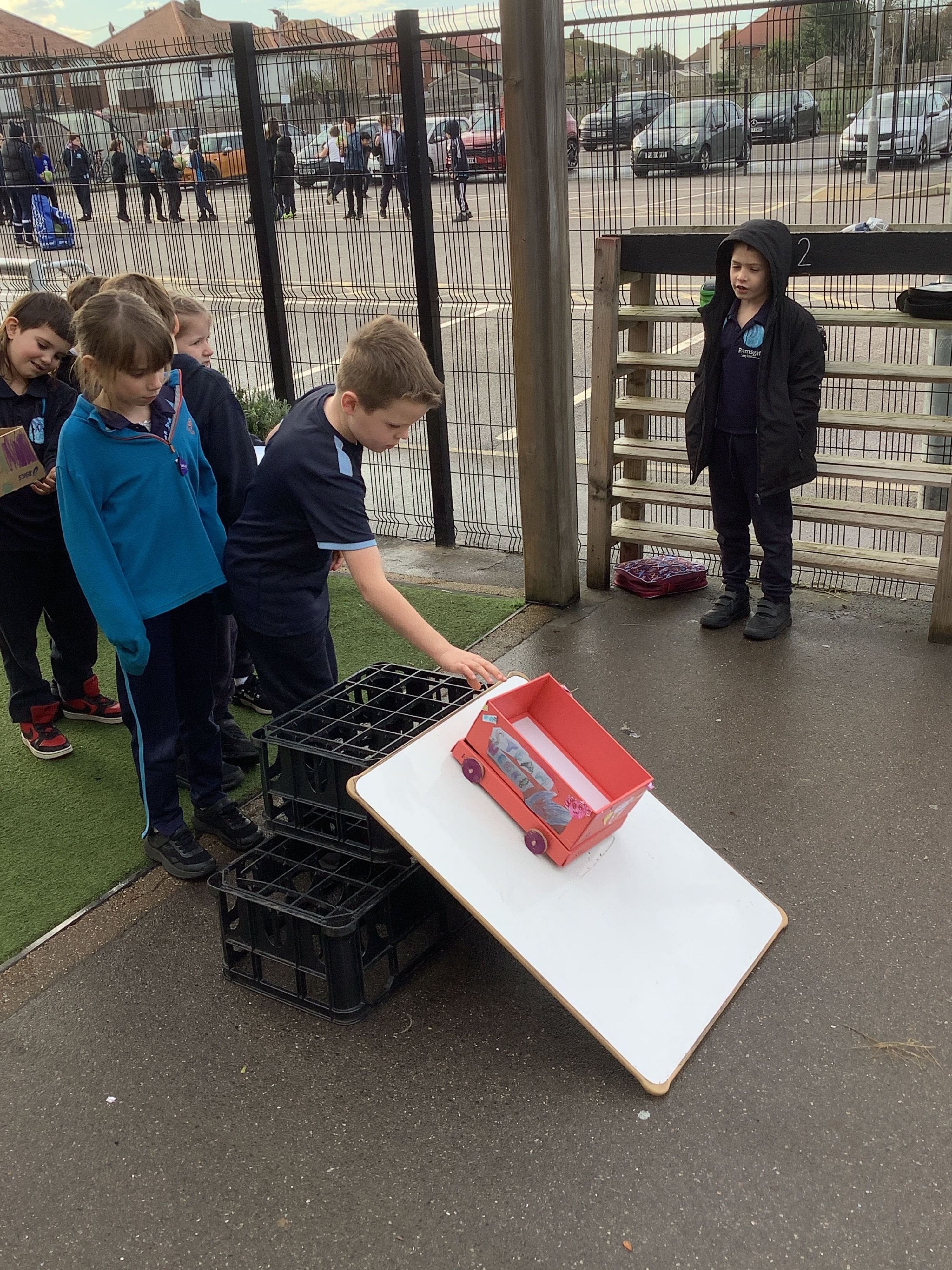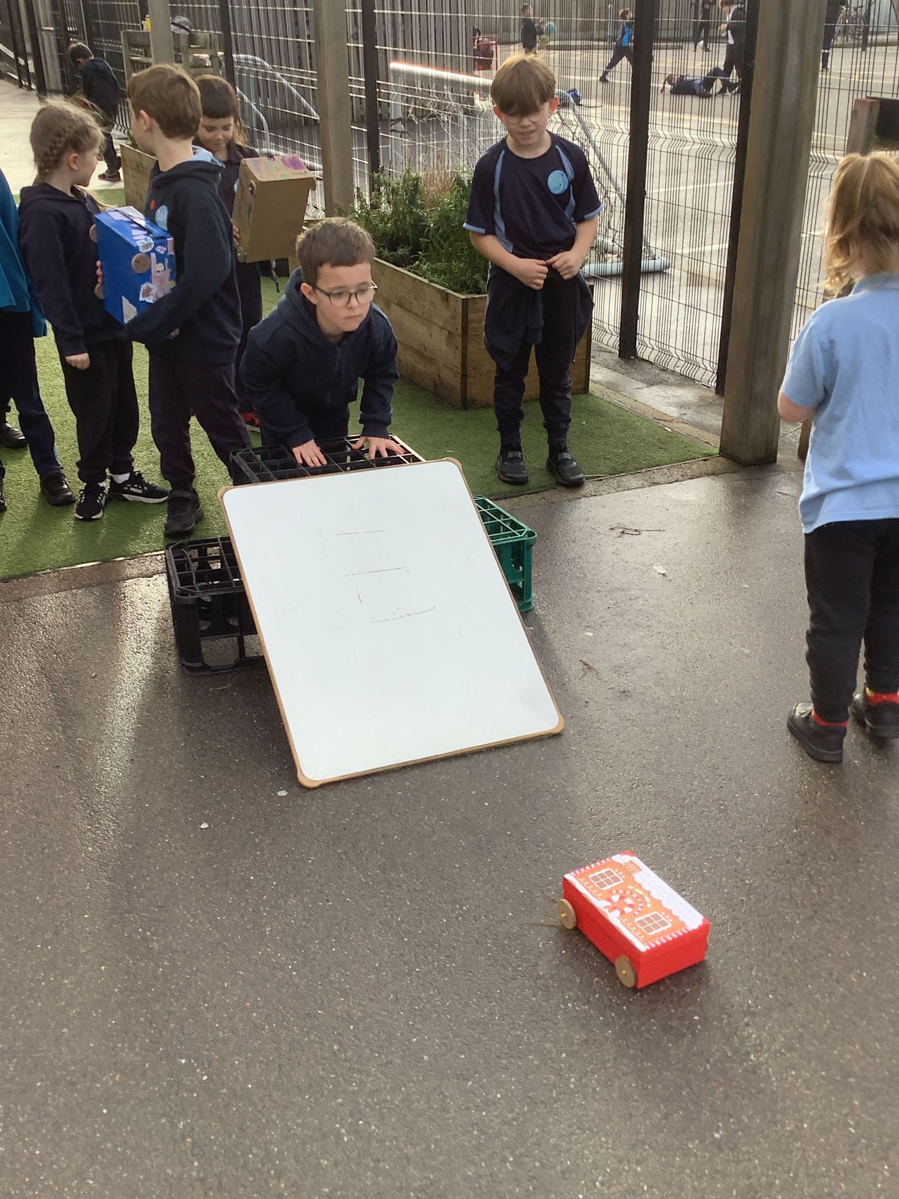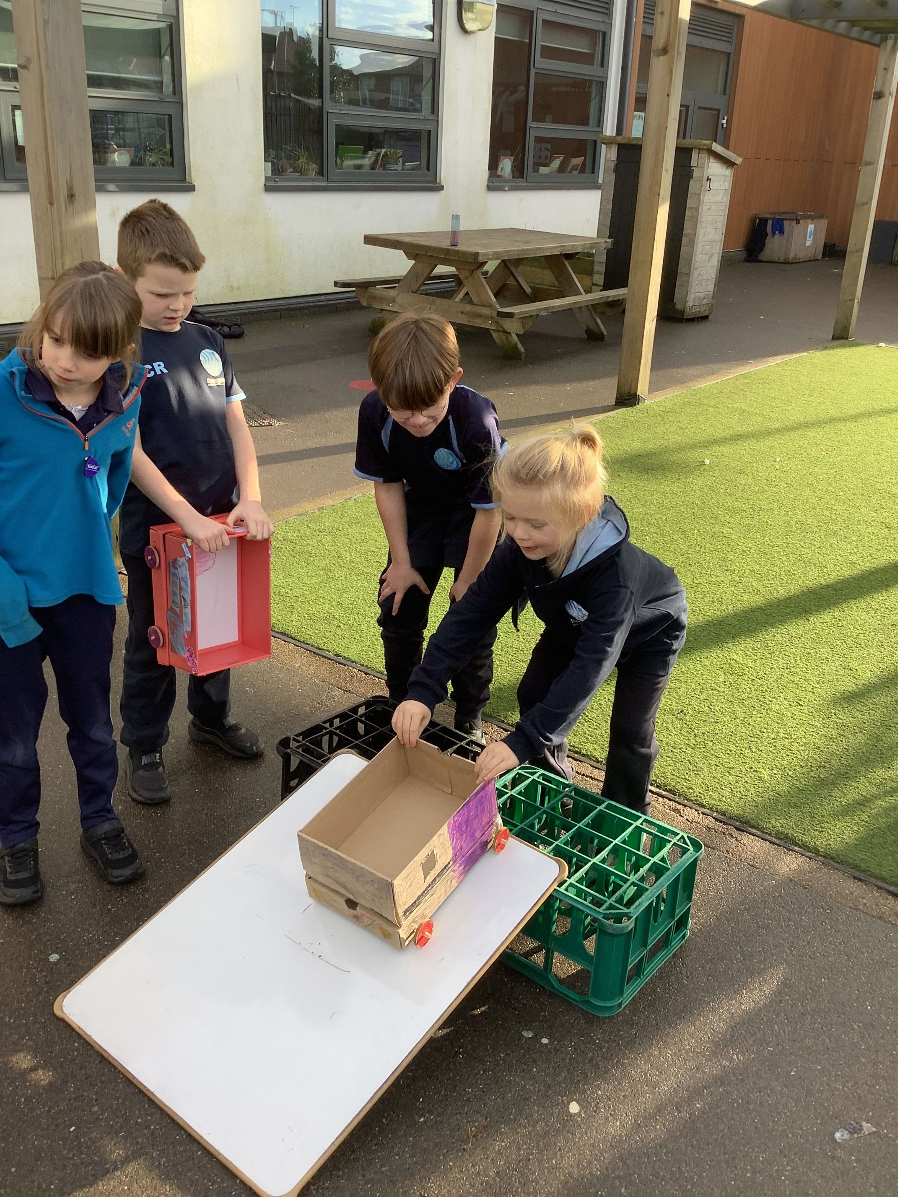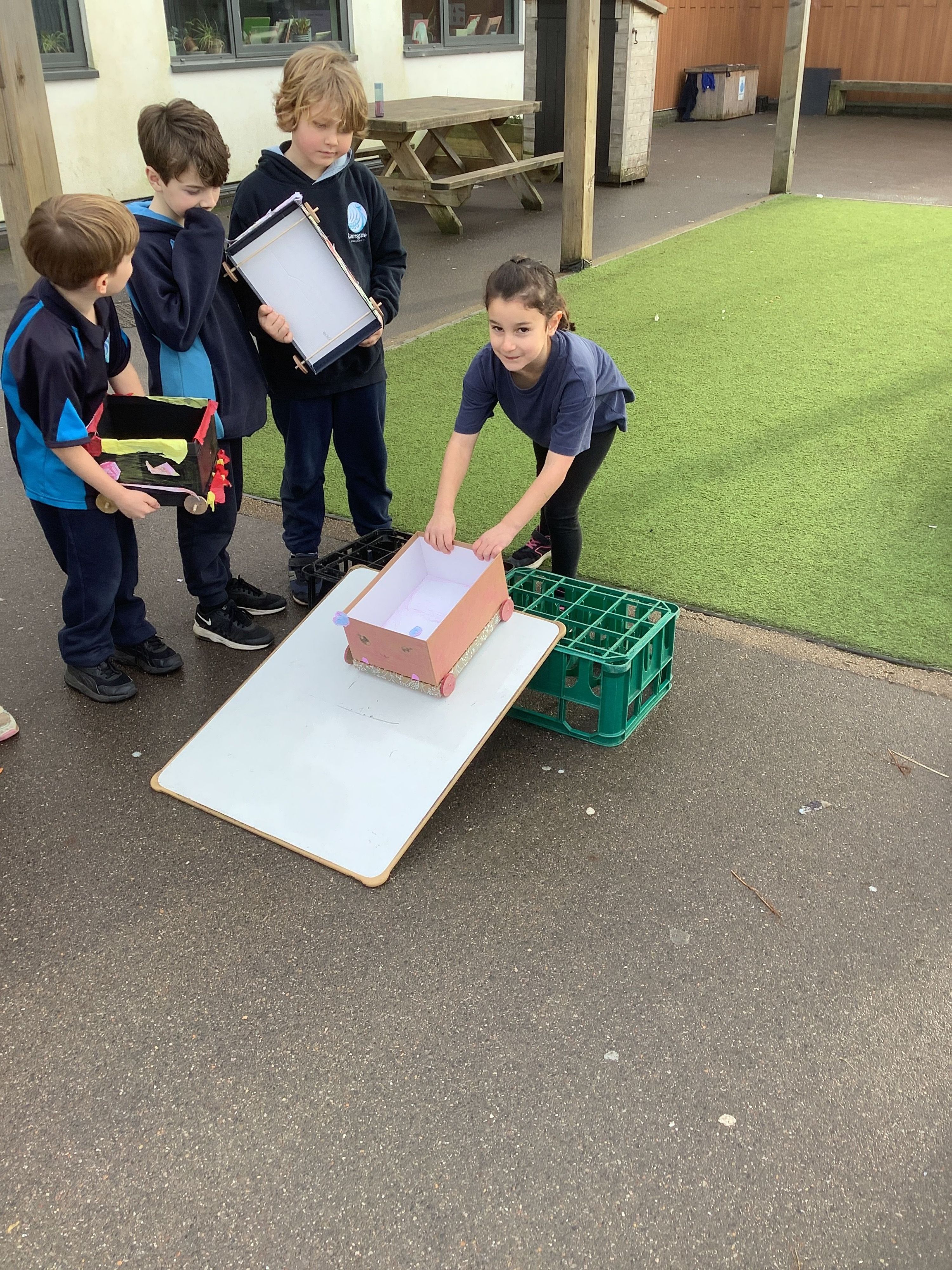 In the afternoon, we tested our vehicles. We built a ramp using crates and a whiteboard to launch our cars from. We tested how far our vehicles travelled. We then made the ramp steeper and predicted how this might affect our cars' movement. We were surprised by some of the results.